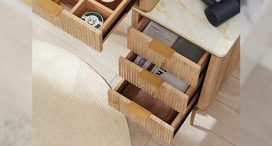 The marble-inspired countertops are skillfully designed to replicate the timeless beauty of real marble. Featuring a built-in charging station, this side table offers the convenience of charging your devices—whether it's your hairdryer, curling iron, or phone—right at your fingertips.