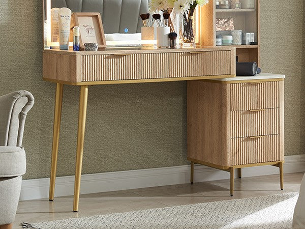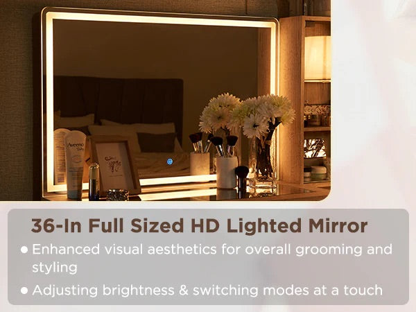 Elevate your beauty routine with the Luxury Modern Fluted Makeup Vanity Desk. Featuring elegant gold metal legs, fluted panels, and a sleek 36" HD lighted mirror, this vanity blends modern design with timeless charm. With ample storage and adjustable lighting, it’s perfect for both beauty enthusiasts and professionals looking for style and functionality.